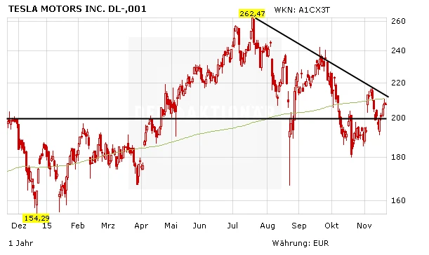 DER AKTIONÄR sieht in Tesla eine Aktie für die Zukunft, auch wenn sich das Unternehmen erst noch beweisen muss. Die Aktie ist zweifelsfrei nicht billig. Doch auch Internet-Riese Amazon ist in eine teure Bewertung reingewachsen – und legt weiter zu. Es bleibt mit Spannung abzuwarten, wie das Model 3, das ab nächsten März den Massenmarkt erobern soll, bei den Kunden ankommt. Charttechnisch kämpft die Aktie derzeit um die 200-Tage-Linie. Zudem befindet sich der Wert nach wie vor unterhalb des mittelfristigen Abwärtstrends. Gelingt der Sprung darüber, wäre dies ein klares positives Signal. Trader können Positionen aufbauen.