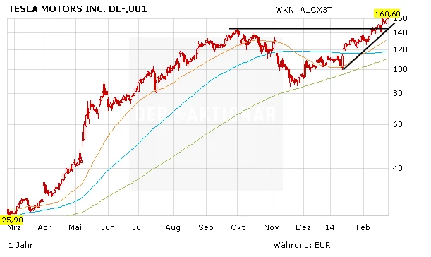 Die Aktie des Elektroautopioniers Tesla ist nicht zu bremsen. Das Papier hat vor kurzem den höchsten Stand seit dem Börsengang im Jahr 2010 erreicht. Rückenwind kam einmal mehr durch die guten Zahlen die Tesla Mitte der abgelaufenen Börsenwoche vorlegte. Damit nicht genug. Tesla-Chef Elon Musk versteht es fast wie kein Zweiter die Erwartungen der Anleger hoch zu halten. Tesla will in Kürze mehr Informationen zu seiner geplanten „Gigafactory“ veröffentlichen. Musk will eigene Batteriespeichersysteme bauen. Das soll zu „großen Kostenreduktionen bei unseren Batterienpaketen führen und das Tempo der Innovationen für Batterien beschleunigen“, heißt es in einem Schreiben des Vorstands. Der Tesla-Vorstand sei daher zuversichtlich, dass durch die Fertigung im Gigawatt-Maßstab ein Elektroauto zu erschwinglichen Preisen angeboten werden könne.