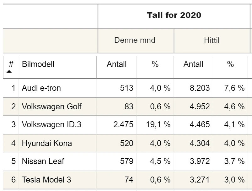 Doch nicht in allen Ländern kann Tesla auf Schützenhilfe eines etwaig neuen Präsidenten hoffen. In Norwegen hat VW den US-Pionier beim Absatz bereits deutlich abgehängt. Neue Zahlen (siehe Grafik) aus dem Elektroauto-Vorzeigeland zeigen, dass dieses Jahr bis Oktober 3.271 Tesla Model 3 verkauft wurden. Die Marken Audi, VW, Hyundai und Nissan haben hingegen jeweils deutlich mehr ihrer Top-Modelle an den Mann gebracht.