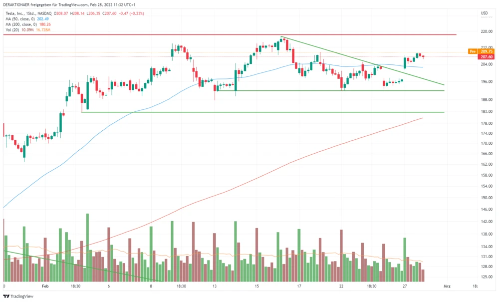 Die Tesla-Aktie konsolidiert nach dem steilen Anstieg zum Jahreswechsel nun schon seit Anfang Februar in einer Seitwärtsrange. Wie im kurzfristigen Chart zu erkennen ist, verengte sich die Spanne nun deutlich. Aus charttechnischer Sicht bildete sie konkret dabei eine abfallende Dreiecksformation aus.