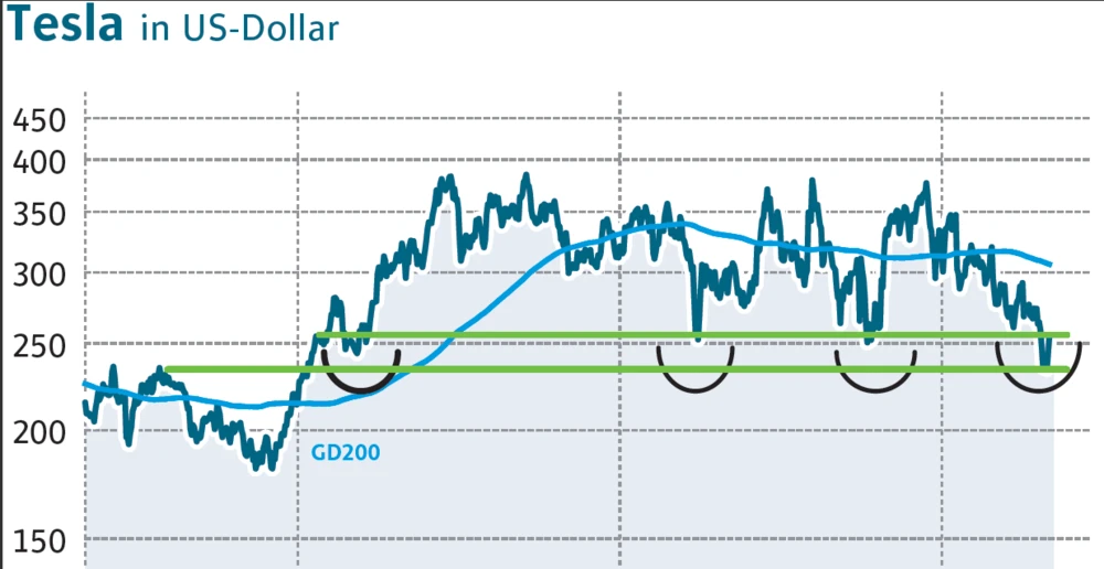 Nach der Bekanntgabe der Kapitalerhöhung durch Tesla kamen die Käufer am Aktienmarkt zurück. Aus technischer Sicht hat die Aktie in den letzten zweieinhalb Jahren drei Mal zwischen 240 Dollar und 250 Dollar wieder nach oben gedreht. Mit der Verschärfung des Handelskriegs zwischen den USA und China kehrt die Unsicherheit zurück. Abwarten! Watchlist.