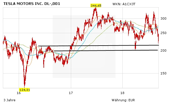 Fakt ist: Die negativen Nachrichten bei Tesla reißen nicht ab. Der Stimmungsumschwung spiegelt sich im Aktienkurs wider. Das Papier notiert mittlerweile bei 280 Dollar. Es droht ein Test des Jahrestiefs aus dem Frühjahr bei 244 Dollar. Es bleibt dabei: Die Aktie ist nichts für Anleger mit zittrigen Händen. Dafür war die Volatilität, sprich die Schwankungsintensität, zuletzt zu hoch. Sehr risikofreudige Investoren wagen bei 240 Dollar (umgerechnet 206 Euro) eine erste kleine Position. Zweites Kauflimit bei 220 Dollar (beziehungsweise 190 Euro). Hier liegen mehrere stärkere Unterstützungen.