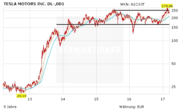 DER AKTIONÄR setzt auf den großen Durchbruch des Elektroautos. Doch das bringt massive Konkurrenz mit sich, was sich ab 2019 zuspitzen und Tesla in Bedrängnis bringen könnte. Auch sind weiterhin Verschiebungen, was den Launch des Model 3 angeht, zu befürchten. Die hohe Fertigungstiefe ist eine Chance – wird aber zum Boomerang wenn es im freien Markt bessere Batterietechnologien als beim fixen Partner Panasonic gibt. Kurzfristig positiv ist jedoch die Spekulation, dass im Juni 2017 endlich der 3. Teil der Präsentation des neuen Tesla über die Bühne geht – und etwa dank neuer Lösungen für den Innenraum der Aktie noch einmal Rückenwind bringt.