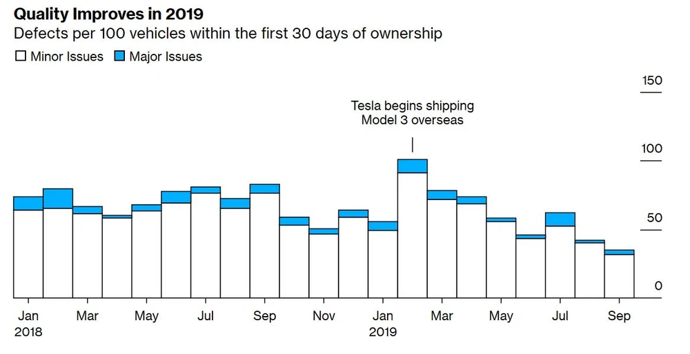 Gleichzeitig gibt es jedoch eine große Studie von Bloomberg, der zufolge tatsächlich die zu Beginn schlechte Qualität beim Model 3 besser geworden ist. So habe es noch im Februar 2019 pro 100 verkaufter Autos 101 Fehler beziehungsweise Kundenbeschwerden gegeben. Im September war laut der neuen Grafik die Anzahl der Vorfälle auf 35 gefallen.