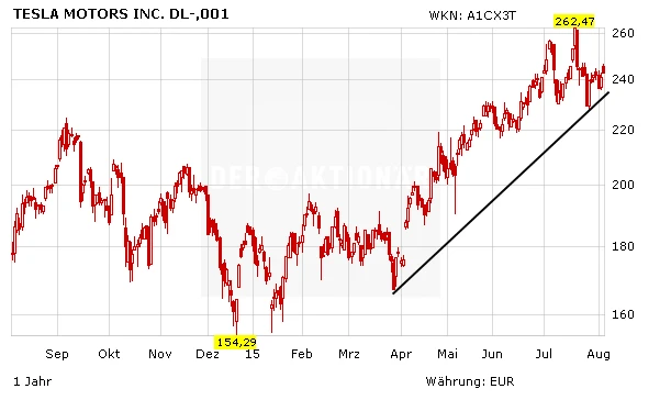 Es sind vollmundige Ankündigungen, die Tesla wieder einmal von sich gibt. Doch die großen Autobauer wie BMW und Daimler sollten den erfolgsverwöhnten US-Konzern durchaus ernst nehmen. Kurzfristig stehen allerdings erst einmal die Zahlen am Abend in den Blickpunkt. Nachdem die Unterstützung bei 260 Dollar zunächst gehalten hat, rückt bei guten Zahlen das Jahreshoch bei 285 Dollar wieder in den Fokus. Positiv: In der Vergangenheit reagierte der Aktienkurs meist positiv auf die Zahlen.