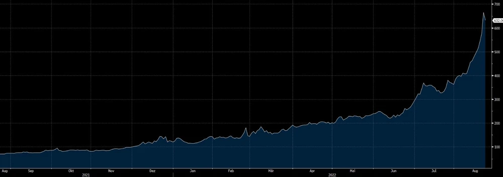 Der Strompreis geht durch die Decke. Für die Lieferung im Jahr 2023 müssen laut aktuellem Bloomberg-Chart mittlerweile mehr als vier Mal so viel wie Anfang des Jahres bezahlt werden. Diese Großhandelspreise drohen früher oder später massiv beim Endkunden und Elektroauto-Fahrern anzukommen.