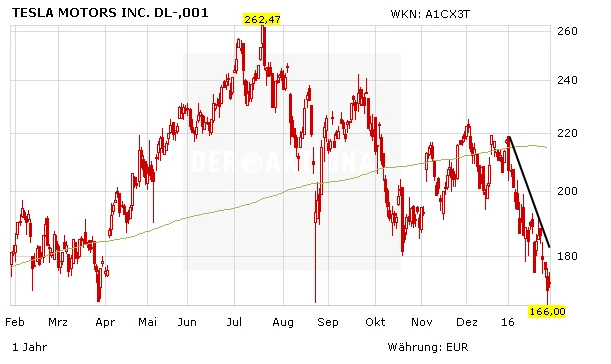 Unabhängig davon, ob nun ein Model 3-Fahrzeug oder mehrere veröffentlicht werden: Es stecken große Hoffnungen und zugleich hohe Erwartungen in dem neuen Elektroauto. In letzter Zeit gab es für Tesla jedoch einige Probleme. Das Jahresabsatzziel wurde nur knapp erreicht. Die Prognosen für China wurden nach unten revidiert. Die Aktie ist indes deutlich angeschlagen. Zuletzt rutschte das Papier deutlich unter die 200-Euro-Marke. Neuanleger halten sich deshalb aktuell zurück.