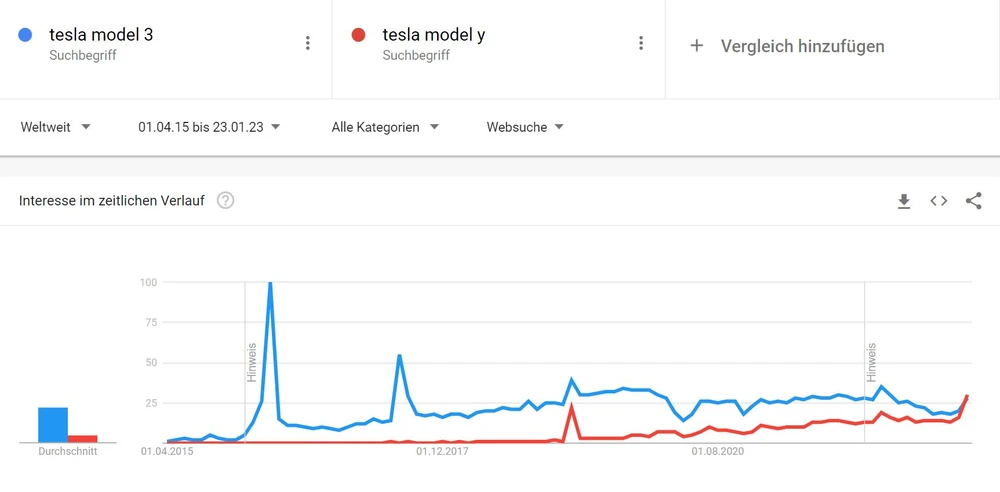 Der Google-Trends-Vergleich zwischen dem Model 3 und dem jüngeren Model Y zeigt, dass das SUV zwar nie den Hype wie anfänglich das Model 3 auslösen konnte, doch mittlerweile gleich liegt mit dem auf rund ein Drittel gefallenen Interesse des bisherigen Tesla-Verkaufsschlagers.