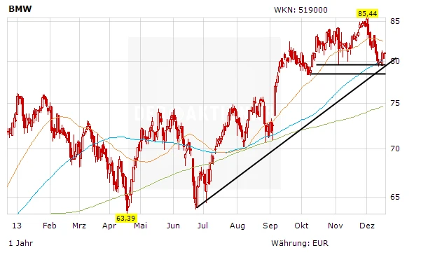Tesla mischt den Automarkt seit einigen Monaten auf. Ungeachtet der ambitionierten Bewertung ist die Tesla-Aktie aus technischer Sicht für Trading-orientierte Anleger ein Kauf. Ein Stoppkurs bietet sich im Bereich von 98 Euro an. Als einziger deutscher Autobauer hat BMW derzeit ein vollkommen neu aufgebautes Elektroauto im Portfolio. Der Aktie ist in den letzten Wochen etwas der Saft ausgegangen. Bei rund 80 Euro hat das Papier aber einen Boden gefunden. Neukäufe bieten sich an.