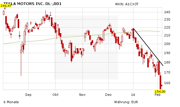 Charttechnisch ist die Tesla-Aktie stark angeschlagen. Seit Jahresbeginn hat das Papier fast 30 Prozent an Wert verloren. DER AKTIONÄR rät Anlegern, nicht in das fallende Messer zu greifen. Auch wenn die Aktie mittelfristig aussichtsreich bleibt, scheint kurzfristig keine Besserung in Sicht. Die Zahlen dürften aufgrund der Probleme in den letzten Monaten vor allem bei der Produktion und Auslieferung des Model X keine großen positiven Impulse für die Aktie liefern. Das Model 3 könnte ab März für frischen Wind sorgen. Mit diesem Elektroauto will Tesla den Massenmarkt erobern. Investierte Anleger beachten den Stopp bei 155 Euro.