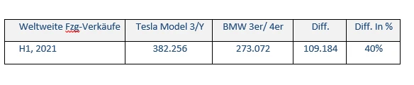 "Tesla hat weltweit im ersten Halbjahr 40 Prozent mehr Model 3/Y verkauft wie BMW von seiner 3er/4er Baureihe."