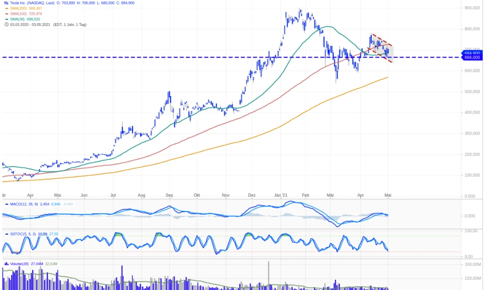 Neue Impulse für die Aktie jedenfalls leierten die Zahlen keine. Das Papier bewegt sich derzeit charttechnisch weiterhin neutral. „Nach dem Verlassen des bis Anfang Februar intakten Aufwärtstrends haben sich die Papiere von Tesla zwischenzeitlich bis auf 539 UDollar verbilligt. Der daraus resultierende Aufwärtsmodus wurde aber bereits am 27.04.2021 durch ein „Exhausting-Gap“ verlassen. Ein kurzfristiger Abwärtsmove ist daraus die Folge. Hoffnung macht nun der Vierfachboden bei 665 Dollar. Allerdings bedarf der Ausbruch aus dem kurzfristigen Abwärtsmove Notierungen oberhalb von 725 US-Dollar. Hier tendiert aktuell auch die 100-Tage-Linie. Die Quintessenz aus der markttechnischen Betrachtung lässt sich als neutral erachten. Sämtliche wichtigen Indikatoren weisen darauf hin“, sagt Charttechnik-Experte Martin Utschneider von Donner & Reuschel.