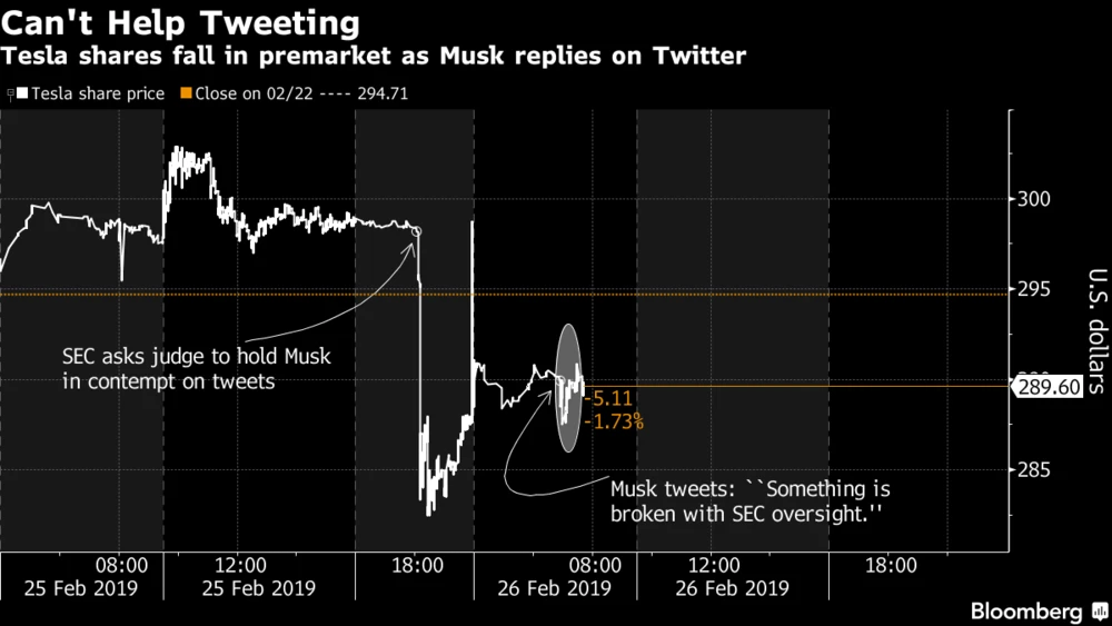 Frei übersetzt beschwert sich Musk, dass mit der SEC-Aufsicht ewas "nicht in Ordnung" sei. Die Börsenaufsicht SEC fordert gerichtliche Maßnahmen weil er gegen Auflagen eines Vergleichs verstoßen habe. Das geht aus einem Antrag hervor, den die SEC beim Gericht in Manhattan eingereicht hat.