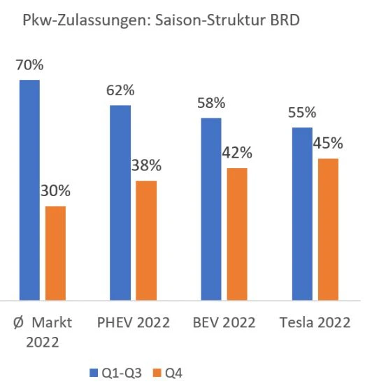 Auffällig sei, dass viele Autos zum Jahresende ausgeliefert wurden. „Noch extremer sieht die saisonale Struktur vollelektrischer PKW(BEV) oder gar bei Tesla aus. 42 Prozent der jährlichen Elektroauto-Zulassungen erfolgten in nur drei Monaten, bei Tesla waren es gar 45 Prozent.“ Bei Tesla sei zum Jahresende erkennbar gewesen, dass nicht nur in China die Preise für die Volumenmodelle Model S und Y gesenkt wurden. So seien im Monat November 3.196 Tesla Neuwagen über Vermieterzulassungen vermarktet worden – 30 Prozent der Zulassungen.