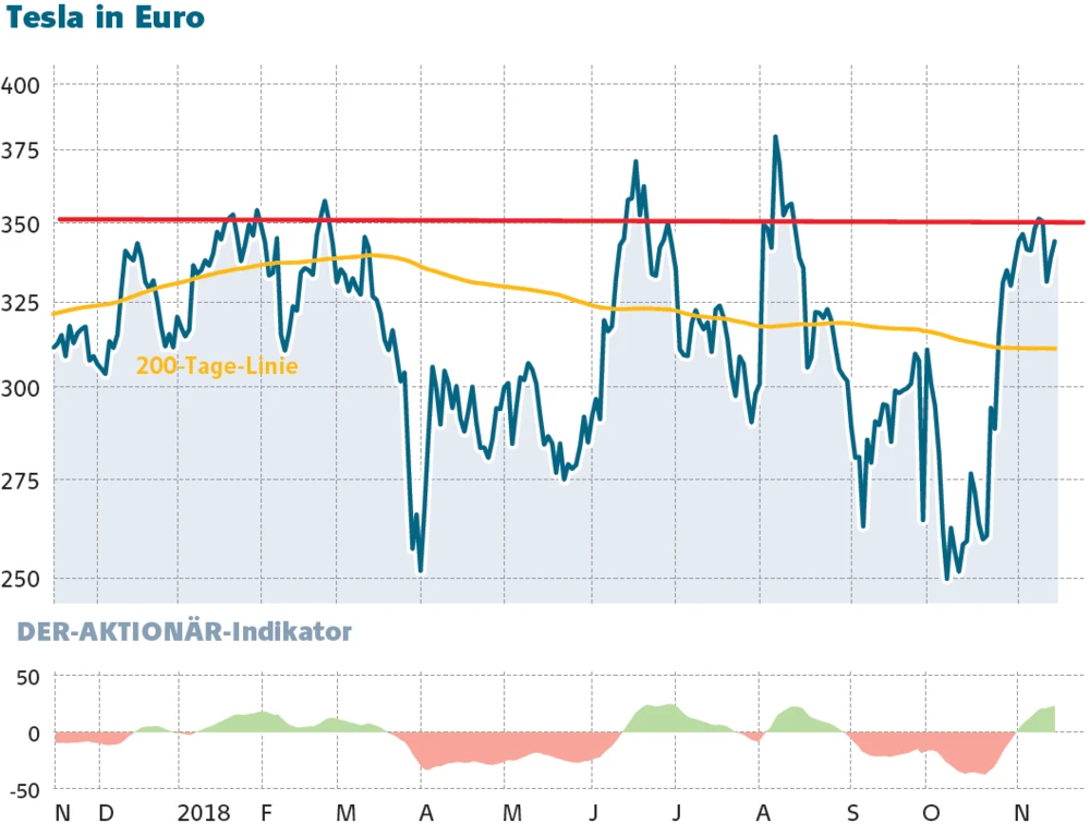Die Tesla-Aktie konnte nach den Q3-Zahlen Ende Oktober den kurzfristigen Abwärtstrend stoppen und hat erneut den Widerstand bei 350 Dollar getestet. Wie auch in den zwölf Monaten zuvor konnte die Marke allerdings nicht nachhaltig überwunden werden. DER AKTIONÄR rät weiterhin an der Seitenlinie abzuwarten.