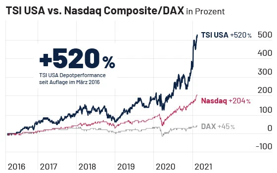 Im März 2016 startete TSI USA mit anspruchsvollen Vorhaben, die nicht nur umgesetzt, sondern übertroffen wurden: Die erste Verdopplung wurde bereits 2017 erreicht (geplant 2019), die 300-Prozent-Marke wurde dann im August letzten Jahres erreicht … und was steht als Nächstes an? 1.000 Prozent bis 2026 – und der Backtest zeigt: Das ist kein kühnes, sondern ein realistisches Ziel. Und auch die aktuelle Performance von 520 Prozent in fast genau fünf Jahren zeigt: TSI USA ist auf Kurs.
