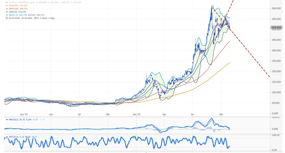 Schafft das Papier die Wende, oder drohen doch die 350 Dollar? Das ist seit ein paar Wochen die viel gestellte Frage beim Anblick der Tesla-Aktie. „Durch die auffällig hohen Tageschwankungen hatte sich seit Anfang September eine volatile Keilformation gebildet. Diese spitzte sich bei rund 440 Dollar deutlich zu. Der Bruch der 440 Dollar bewirkte einen kurzfristigen Abwärtskanal. Dieser könnte nun den Weg in Richtung 350 Dollar ermöglichen. Allerdings tendiert das Untere Bollinger-Band bei 401 Dollar und stützt die Aktie aktuell. Es bleibt weiterhin volatil. Der Trendfolger MACD zeigt sich neutral. Die kurzfristige Slow-Stochastik generiert ein Verkaufssignal“, sagt Charttechnik-Experte Martin Utschneider von Donner & Reuschel.