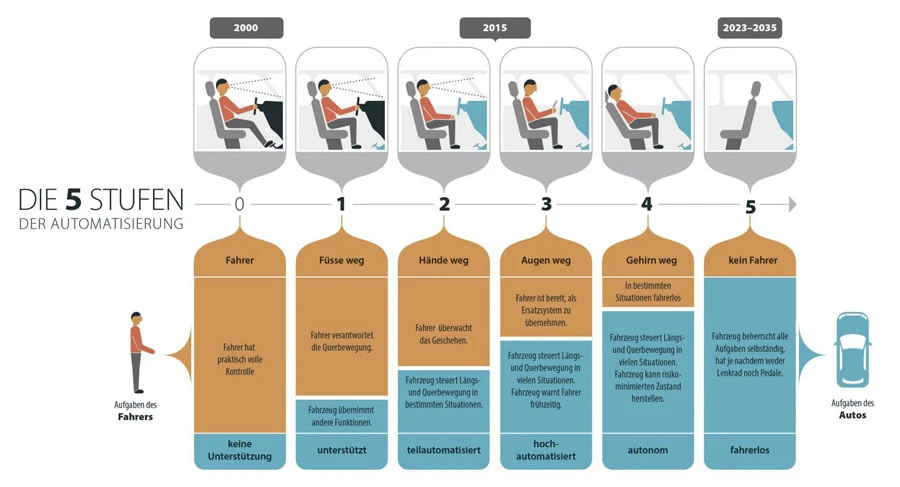 Ab sofort erhalten laut Tesla-Chef Elon Musk alle Fahrzeuge diese neue Technik. Mit insgesamt acht Kameras sowie Radar-Sensoren mit einer höheren Reichweite beziehungsweise Auflösung und einer 40-fachen Rechenleistung eines Computers wartet die neue Hardware auf. Damit kann ein Tesla im 360 Grad-Winkel bis zu 250 Meter vorausschauend fahren. Theoretisch könne mit der neuen „Hardware 2“ das Fahrzeug alleine von A nach B befördert werden. Jedoch bedarf es der Zustimmung der jeweiligen Aufsichtsbehörden und tausende Testkilometer, bis die fünfte Stufe der Automatisierung erreicht ist (siehe Grafik).