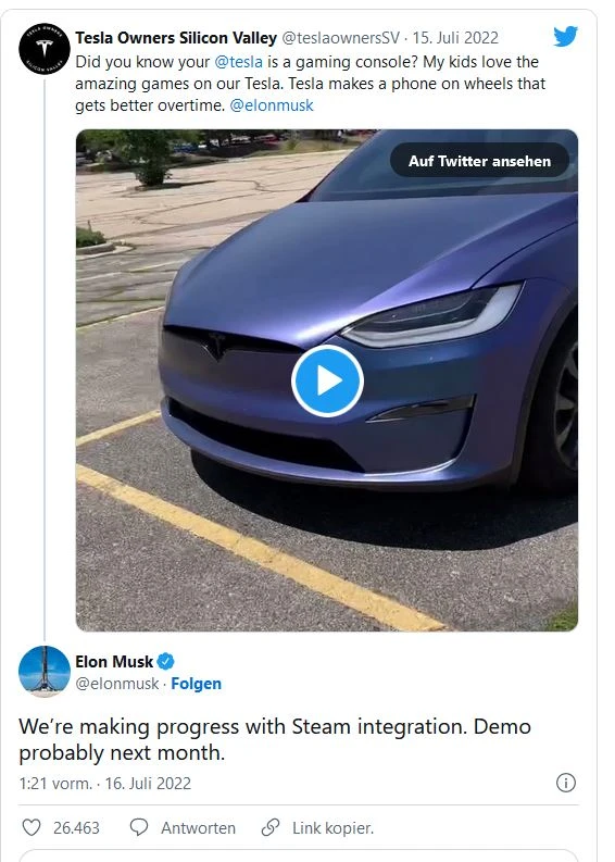 In der vergangenen Woche äußerte sich auch Firmenchef Elon Musk zu dieser Thematik. Tesla komme der Steam-Integration immer näher. Bereits kommenden Monat strebe man eine Präsentation dazu an, um die neuen Möglichkeiten die sich daraus ergeben, aufzuzeigen. "Wir machen Fortschritte bei der Integration von Steam. Demo wahrscheinlich nächsten Monat", schrieb Musk auf Twitter. Die Demonstration wird wahrscheinlich einige rechenintensive Videospiele beinhalten, um die Spielkapazität in Tesla-Fahrzeugen zu demonstrieren.