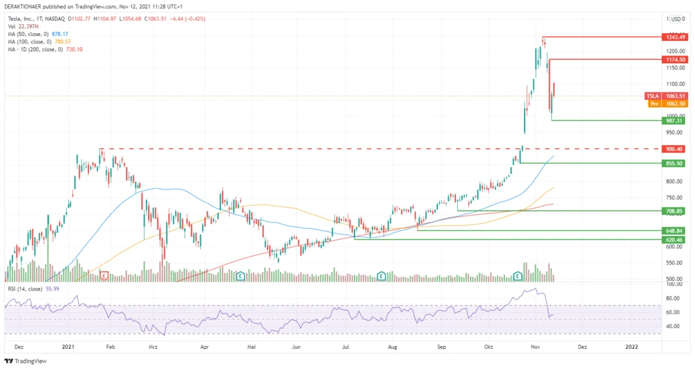 Ende Oktober knackte die Tesla-Aktie das alte Allzeithoch bei 900 Dollar. Durch das neue Kaufsignal schoss die Aktie in wenigen Tagen bis auf 1.243 Dollar in die Höhe. Die Rekordnotierung nutzten einige Großaktionäre wie Elon Musks Bruder und Cathie Wood, um Teilverkäufe durchzuführen.