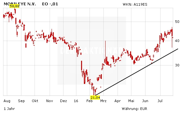 Die Aktie von Mobileye ist nach dem Aus bei Tesla um zehn Prozent eingeknickt. Und das obwohl Mobileye selbst die Partnerschaft beendet hat. „Wir haben einfach entschieden, wo wir unsere Ressourcen für die Zukunft der selbstfahrenden Autos konzentrieren wollen“, so Amnon Shashua, Cheftechnologe von Mobileye, in einer Telefonkonferenz mit Analysten. Der Rücksetzer der Aktie könnte durchaus noch bis in den Bereich von 42 Dollar führen. Hier wartet die untere Begrenzung des Aufwärtstrends, der sich seit Februar 2016 ausgebildet hat. Wer investiert ist, bleibt dabei. Auf dem aktuellen Niveau bietet sich eine interessante Einstiegschance!
