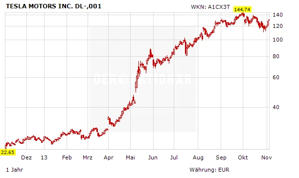 Dass Tesla exorbitant hoch bewertet ist, stört die Anleger aktuell wieder weniger. Jedes der 21.000 Elektrofahrzeuge, die der kalifornische Elektroautopionier Tesla 2013 verkaufen will, steht für eine Marktkapitalisierung von knapp 924.000 Dollar (671.000 Euro) bei der Aktie. Wie viele Autos der Konzern im vergangenen Quartal verkauft hat, wird Tesla heute Abend veröffentlichen.