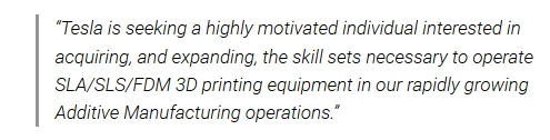 Tesla (TSLA) will in der Gigafactory Nevada in den 3D-Druck einsteigen, wie aus einer neuen Stellenausschreibung des Autoherstellers hervorgeht, in der Tesla seine "schnell wachsenden Additive Manufacturing-Aktivitäten" erwähnt.