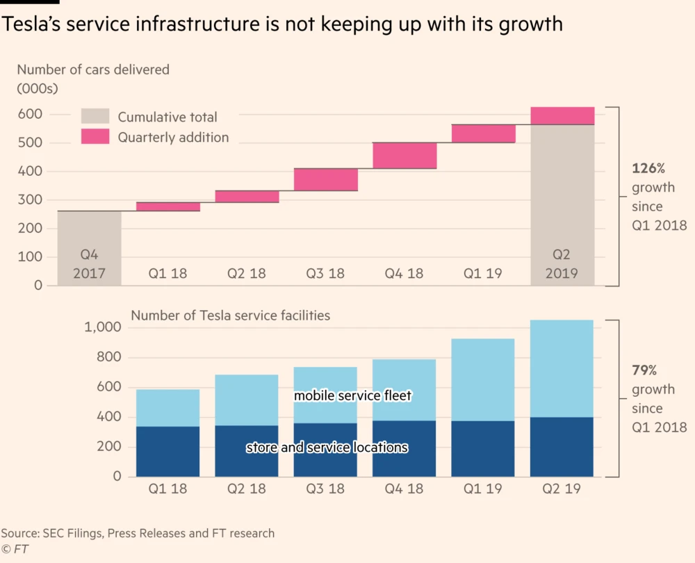 Tesla hat im zweiten Quartal 400 Millionen Euro Verlust eingefahren. Doch wichtiger als historische Zahlen ist die Zukunft, wozu untrennbar die Kundenzufriedenheit und Marke gehört. Bisher sind die meisten Kunden sehr zufrieden und empfehlen den Kauf eines Tesla ihren Bekannten weiter. Doch in den letzten Wochen gibt es immer wieder auch kritische Stimmen von Fahrern, die auf lange Wartezeiten in Service-Hotlines hinweisen. Offenbar kann die Infrastruktur – auch wegen Sparmaßnahmen - aktuell nicht mit dem Stückwachstum Schritt halten. So zeigt die Financial Times in einer neuen Grafik: Seit Anfang 2018 sind 126 Prozent mehr Teslas auf den Straßen aber nur 79 Prozent zusätzliche Service-Center und –Flotten hinzugekommen.