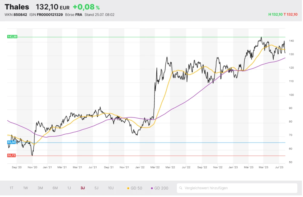 Thales ist im Vergleich zu Rheinmetall breiter aufgestellt und nimmt zum Beispiel im Bereich der Cybersicherheit im Weltraum eine führende Stellung ein. So haben die Franzosen kürzlich einen Auftrag von der Europäischen Weltraumorganisation (ESA) in Höhe von knapp 60 Millionen Euro für die Sicherheit des Satellitensystems GALILEO erhalten. Solange die Aktie die 200-Tage-Linie bei 128 Euro nicht unterschreitet, dürfte sich ein Investment langfristig lohnen.