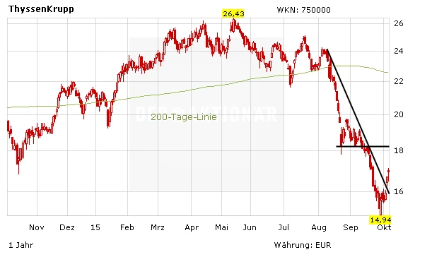 Michael Shillaker hat ThyssenKrupp nach den jüngsten Kursverlusten von "Neutral" auf "Outperform" hochgestuft. Das Kursziel senkte Analyst Shillaker allerdings von 26 auf 24 Euro, nachdem er die Gewinnschätzungen für den Industriekonzern reduziert hatte. Die Gewinnrisiken insbesondere im Stahlgeschäft seien mittlerweile ausreichend in den Kurs eingepreist, schrieb der Experte in einer Studie. Zudem sei der DAX-Konzern strukturell in einem besseren Zustand als noch 2012 und 2013. Diese Meinung war vertrat gestern auch Marc Gabriel vom Bankhaus Lampe.
