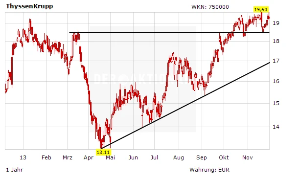 Die Thyssen-Aktie bleibt weiterhin durchaus eine aussichtsreiche Comeback-Story für das nächste Jahr. Für den Konzern bedeutet dies aber noch jede Menge Arbeit. Anleger bleiben mit einem Stopp bei 16 Euro investiert, sollten sich aber des Risikos eines Investments in ThyssenKrupp bewusst sein.