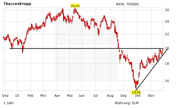 Die Aktie von ThyssenKrupp notiert nun unmittelbar unter der 20-Euro-Marke, wo ein massiver Widerstand verläuft. Ein Ausbruch über diese Hürde wäre ein deutliches Kaufsignal – dynamische Anschlussgewinne dürften folgen. Anleger sollten sich auf die Lauer legen.