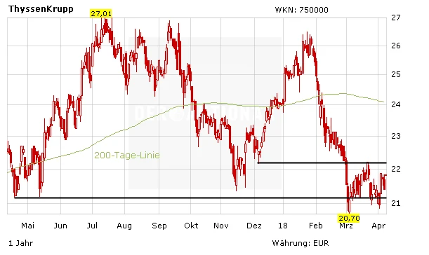 Die ThyssenKrupp-Aktie hat einen Boden ausgebildet. Gelingt die Abspaltung der Stahlsparte im Mai, sollte dies nach der langen Hängepartie neue Impulse freisetzen. Eine Neubewertung wäre dann nötig. Mit dem nachhaltigen Sprung über den Widerstand im Bereich von 22,20 Euro würde die Aktie ein neues Kaufsignal generieren.