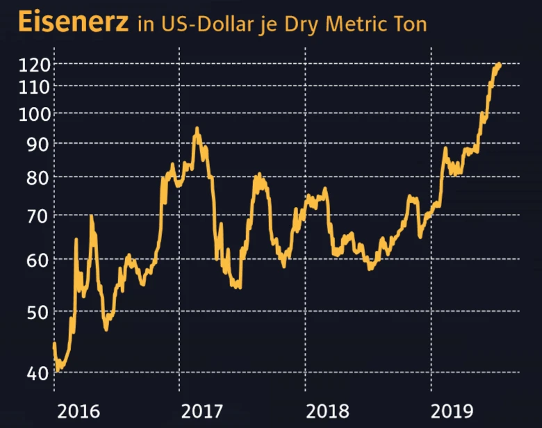 Gleichzeitig steigen die Eisenerzpreise seit Jahren. Der starke Preisanstieg des wichtigsten Stahl-Vorproduktes tut aktuell besonders weh. Denn wegen der mangelnden Nachfrage können die höheren Preise nicht an die Kunden weitergegeben werden.