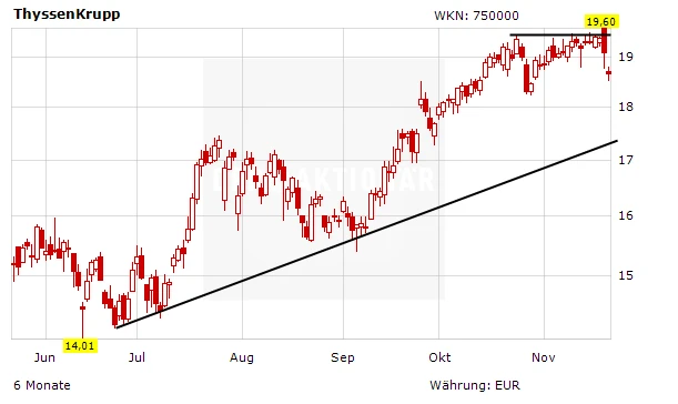 Trotz der positiven Analystenstimme steht die Thyssen-Aktie unter Druck. Nach dem Rücksetzer der vergangen Tage ist ein Ausbruch über die 20-Euro-Marke vorerst außer Reichweite. Anleger, die der Trading-Empfehlung des AKTIONÄR gefolgt sind, sollten die Reißleine ziehen.