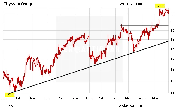Charttechnisch ist die Lage bei ThyssenKrupp derweil nach wie vor gut. Der seit Juli 2013 gültige Aufwärtstrend ist nach wie vor intakt. Zudem sichert die Unterstützung bei rund 20,70 Euro den Titel vor weiteren Kursverlusten ab. Die Analysten sind sich derweil relativ uneinig bezüglich der Thyssen-Aktie. Zwölf Experten raten zum Kauf der Papiere, dem stehen ebenfalls zwölf Verkaufsempfehlungen gegenüber. Zudem nehmen 13 Analysten eine Halteposition ein.
