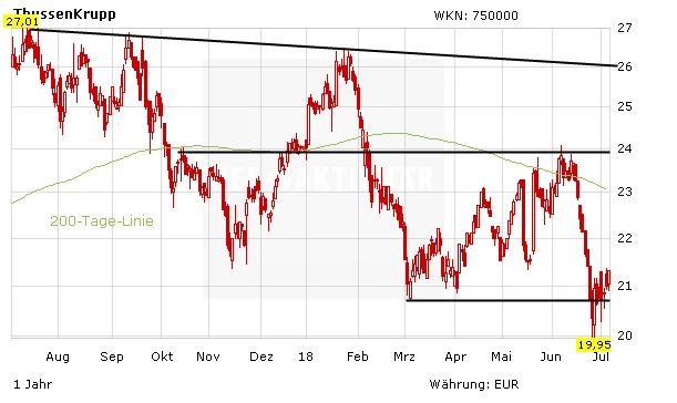 Nach den zähen und langwierigen Verhandlungen mit Tata wird die Stahlfusion kaum an den Auflagen der Wettbewerbshüter scheitern. Die Konzerne werden vielmehr auch zu Zugeständnissen bereit sein. Mit dem Umbau geht ThyssenKrupp den richtigen Weg. Die Aktie zieht nach anfänglichem Zögern inzwischen an und steht vor einer Neubewertung. Anleger setzen zunächst auf einen raschen Anstieg bis zur 24-Euro-Marke. DER AKTIONÄR setzt im Real-Depot mit einer Trading-Position auf steigende Kurse.