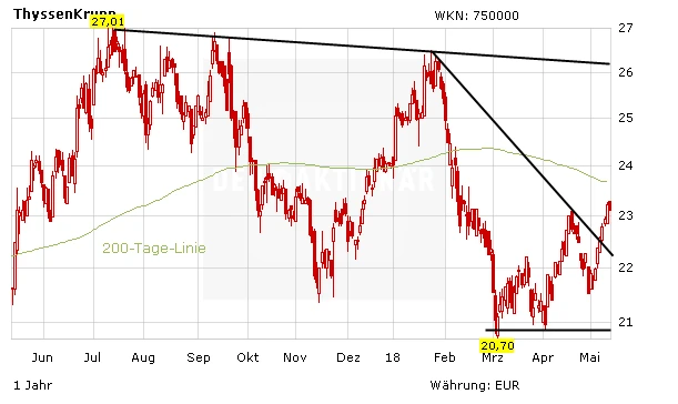 Die ThyssenKrupp-Aktie ist aus dem Abwärtstrend ausgebrochen. Anleger können nun mit einer spekulativen Position darauf setzen, dass die Quartalszahlen gut ausfallen. In diesem Fall dürfte die Aktie schnell weiter steigen. Auch das Jahreshoch bei 26,52 Euro rückt dann wieder in den Fokus. Langfristig ist die Aktie ohnehin unterbewertet. Deutlich höhere Kurse wären ohne den hohen Konglomeratsabschlag gerechtfertigt.