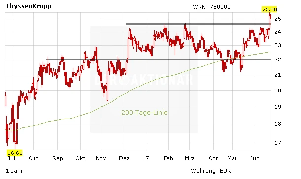 Trotz der angeschlagenen Bilanz stimmt das Bild bei ThyssenKrupp. Im Anlagenbau ist langsam Besserung in Sicht. Die angestrebte Tata-Fusion beim Stahl würde ohnehin eine Neubewertung nötig machen. Zudem spricht das Chartbild mit dem Ausbruch aus dem Seitwärtstrend für steigende Kurse. Anleger lassen die Gewinne laufen.