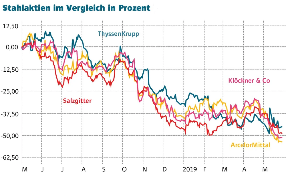 So schraubt der weltgrößte Stahlhersteller ArcelorMittal seine Produktionsmengen noch weiter zurück. Nachdem sich die Nachfrage schon im ersten Quartal abgeschwächt habe, halte diese Schwäche nun an. Es handelt sich bei den Kürzungen zwar nur um vorübergehende Maßnahmen, bis sich das Marktumfeld wieder verbessert. Dennoch sorgt die Meldung für einen starken Abverkauf von Stahlwerten.