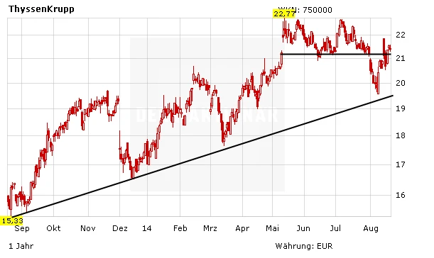 Durch zusätzliche Sparmaßnahmen versucht ThyssenKrupp derzeit seine Profitabilität zu steigern. Nach drei Verlustjahren befindet sich der Industriekonzern inzwischen auf Turnaround-Kurs. Charttechnisch würde der Sprung über den Widerstand bei 22,80 Euro ein wichtiges Signal liefern. Risikobewusste Anleger können auf dem derzeitigen Niveau zugreifen.