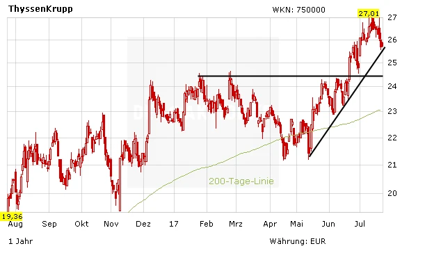 ThyssenKrupp ist auf dem richtigen Weg. Die Entkonsolidierung der Stahlsparte würde die Bilanz aufpolieren und finanziellen Spielraum für die lukrativeren Industriesparten schaffen. Die Aktie steht vor einer Neubewertung, auch das Chartbild stimmt. Kurse über 30 Euro sind möglich.