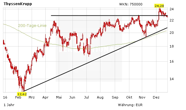 Im leicht freundlichen Marktumfeld können am Dienstag auch die Papiere von ThyssenKrupp wieder zulegen. Kurz vor dem Jahreswechsel steht die Stahlaktie im Vergleich zum Jahrestief im Februar über 80 Prozent höher. Geht es nach den Analysten, setzt sich der positive Trend auch im neuen Jahr 2017 fort.