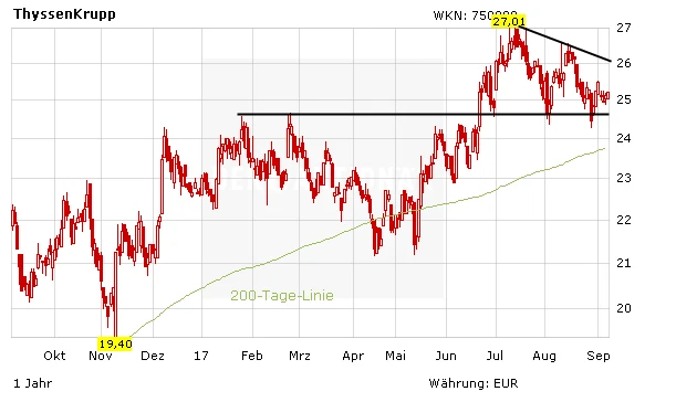 Hiesinger bestätigte auch die Wachstumsziele für den Gesamtkonzern. Ein EBIT von 1,8 Milliarden Euro und eine geringere Verschuldung werden angepeilt. Entscheidend für den Börsenkurs von ThyssenKrupp bleibt zudem die Zukunft der Stahlsparte. Bei den Verhandlungen mit Tata stehen wichtige Termine an. Kommt es hier zu einer Einigung, steht die Aktie vor einer Neubewertung. Kurse über 30 Euro sind dann möglich.