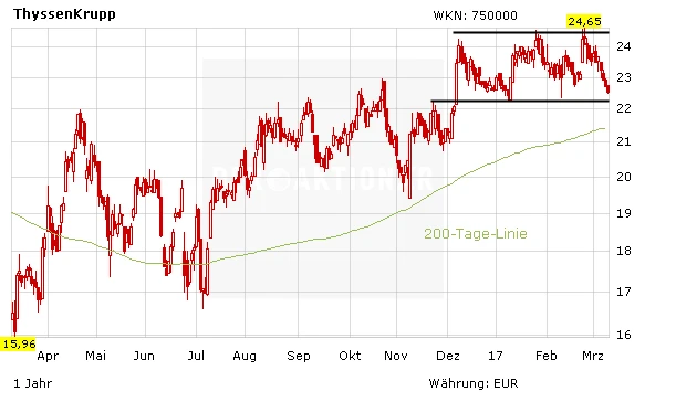 Die ThyssenKrupp-Aktie ist unter Druck geraten. Das Chartbild hat sich wieder eingetrübt. Nach wie vor gelingt der nachhaltige Ausbruch aus der Seitwärtsbewegung nicht. Es wird nun Zeit, dass es eine Lösung für das „Sorgenkind Stahl“ gibt. Dann dürfte es neue Impulse geben. Anleger bleiben an Bord.
