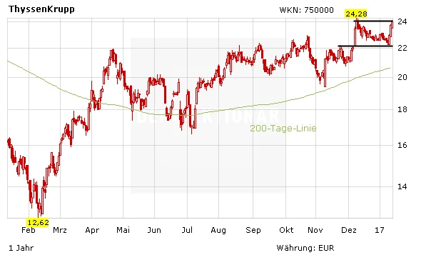 Trotz des Widerstands von den Arbeitnehmern wird Konzernchef Heinrich Hiesinger die Konsolidierung in der Stahlbranche weiter vorantreiben. Die Aktie dürfte davon profitieren. Für zusätzlichen Rückenwind sorgt die Hoffnung auf steigende Stahlpreise. Anleger bleiben an Bord und setzen auf den Ausbruch auf ein neues 52-Wochen-Hoch.