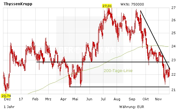 Die Geschäfte bei ThyssenKrupp laufen. Aufgrund des anhaltenden Widerstands gegen die Stahlfusion ist die Aktie zuletzt allerdings unter Druck geraten. Für eine nachhaltige Gegenbewegung wäre es wichtig, Fortschritte bei den Gesprächen mit den Arbeitnehmern zu erzielen. Langfristig bleibt der DAX-Titel aussichtsreich. Investierte Anleger sollten aber das Chartbild beobachten und den Stoppkurs bei 20,80 Euro im Blick behalten.