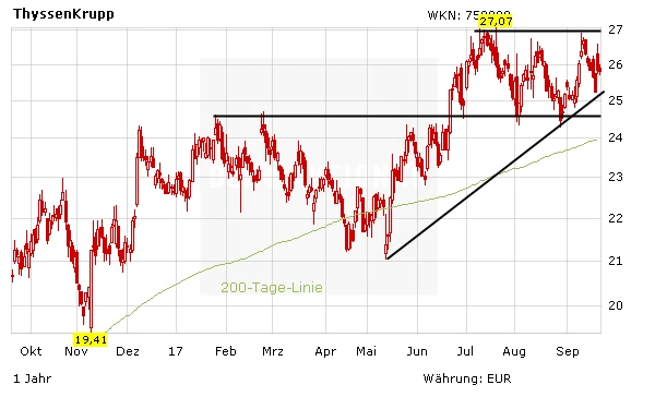Für die Aktionäre wäre das Joint-Venture mit Tata ein sinnvoller Schritt. Es winken zwei bis drei Milliarden Euro Buchgewinn, zudem könnten rund vier Milliarden Euro an Pensionen und Altlasten ausgegliedert werden. Zusätzlich wird mit 400 bis 600 Millionen Euro an Synergien pro Jahr gerechnet. Mit einer verbesserten Bilanz und dem Fokus auf die lukrativeren Technologiesparten sind Kurse über 30 Euro möglich. Anleger setzen zunächst auf den Ausbruch über das Mehrjahreshoch bei 27,07 Euro.