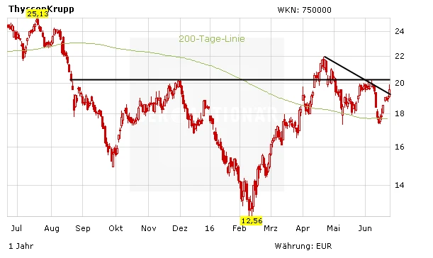 Eine Fusion des kriselnden Stahlgeschäfts käme an der Börse gut an. Die ThyssenKrupp-Aktie steht durch das Plus am Donnerstag bereits vor neuen charttechnischen Impulsen. Gelingt nach dem Bruch des kurzfristigen Abwärtstrends auch noch der Sprung über den horizontalen Widerstand bei 20,20 Euro, wird die Aktie für Neueinsteiger interessant.