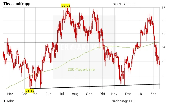 Während der Gewinn sogar über der Konsensschätzung lag, gaben der schwächere Auftragseingang und der hohe Barmittelabfluss Anlass zur Kritik. Nach einer Berg- und Talfahrt am Mittwoch hat die Aktie deshalb etwas nachgegeben. Mit der Stahlfusion und dem Umbau zum Technologiekonzern sollte eine Neubewertung fällig sein. Deutlich höhere Kurse sind dann möglich. Anleger sollten aber den Stoppkurs bei 20,80 Euro im Auge behalten.